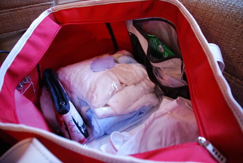 - Cosmetic-type bag stocked with teething aids, extra pacifier and nail clipper