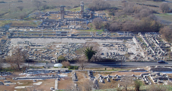 Ruins of Philippi City Center. Foreground: Philippi's Forum. Background: Ruins of market and basilica. Photo by Marsyas